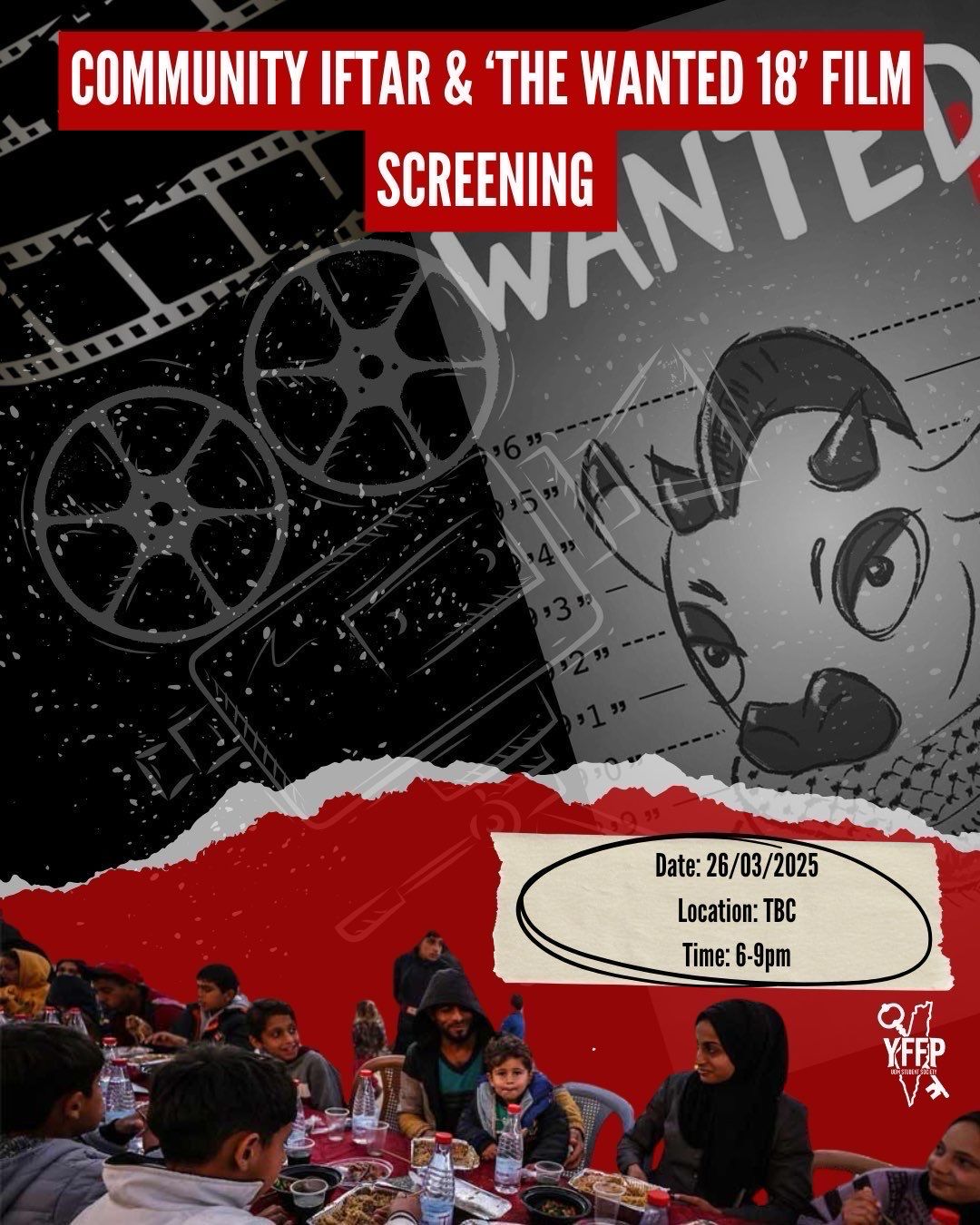 JOIN US THIS WEDNESDAY 6PM FOR A COMMUNITY IFTAR AND A FILM SCREENING OF THE WANTED 18, LOCATION TBC