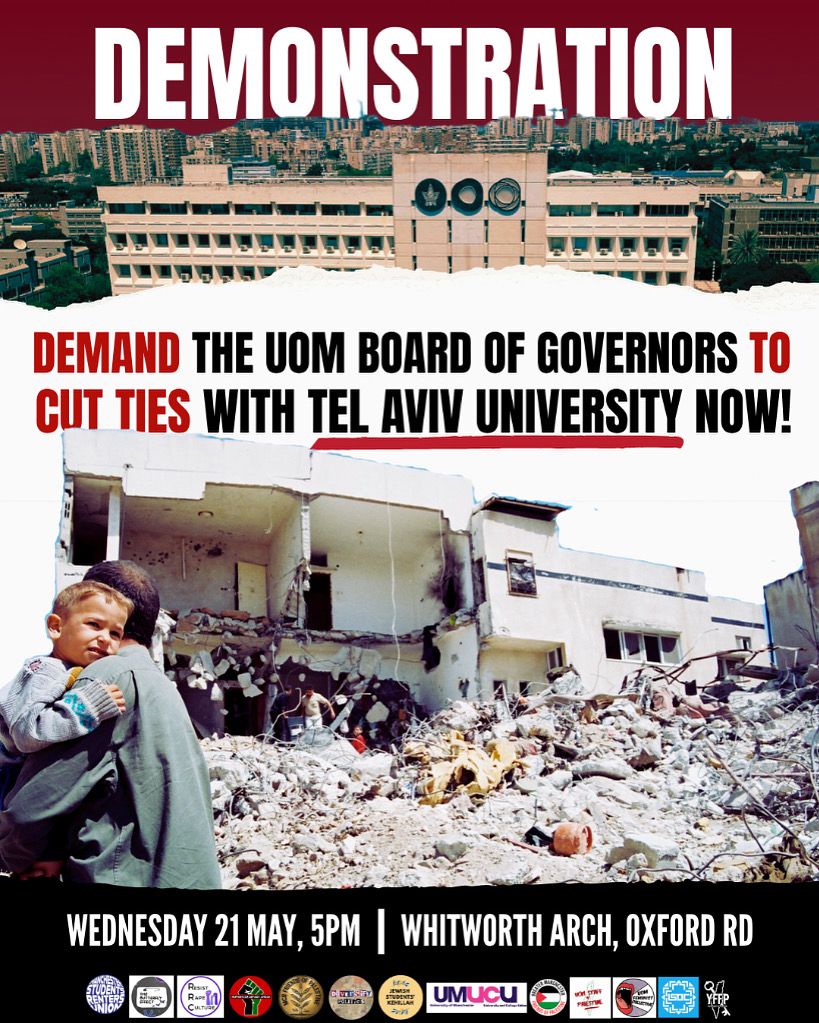 All out on Wednesday 21st May to demand that UoM cut ties with Tel Aviv University.