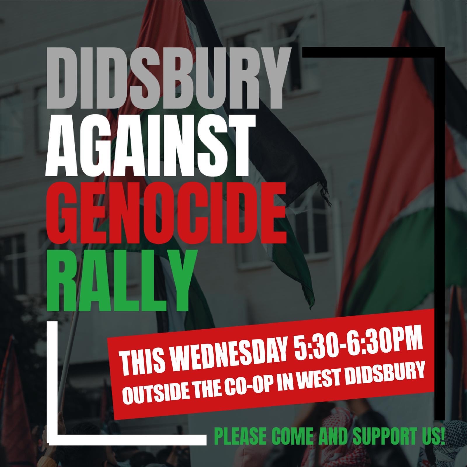 Come join us to raise our voices against genocide during the weekly Didsbury rally.