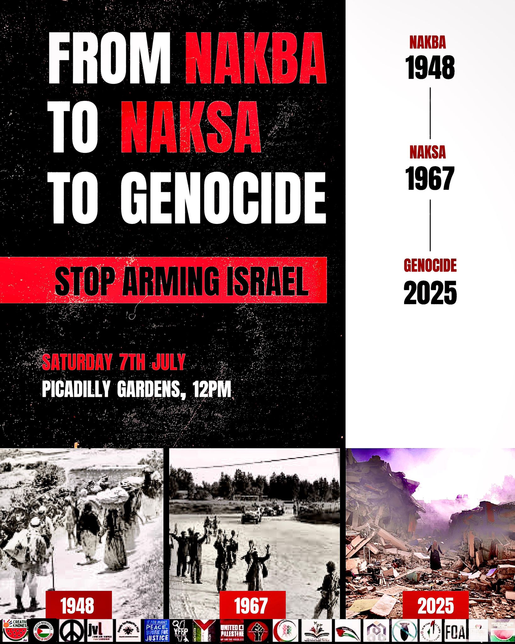 All out this Saturday 7th June in commemoration of the Naksa, as we demand once again that Palestine be freed from Zionist colonisation! Meeting at 12pm, Piccadilly Gardens