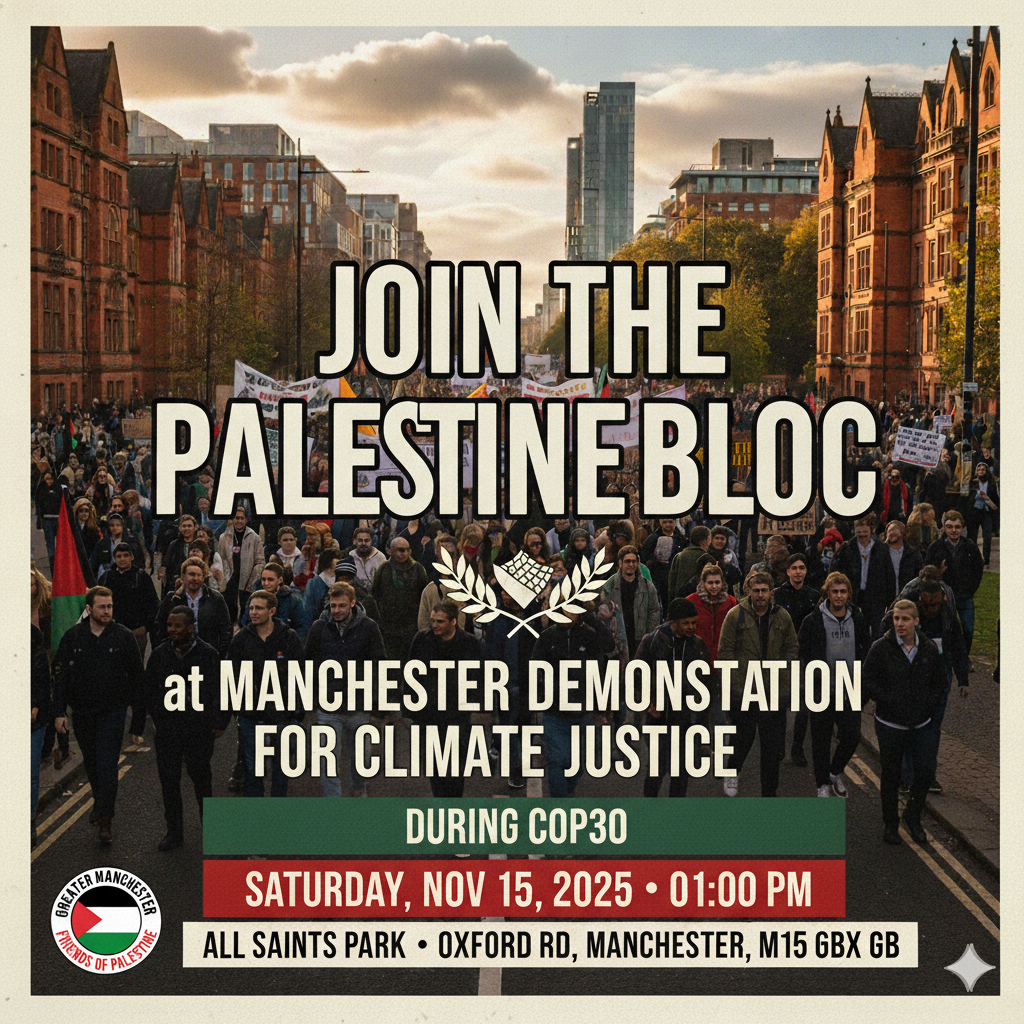 Join the Palestine Bloc at the Manchester Demonstration for Climate Justice during COP30. Let’s make our voices heard, demanding not just climate action, but a just world where all communities can thrive, free from occupation and exploitation.