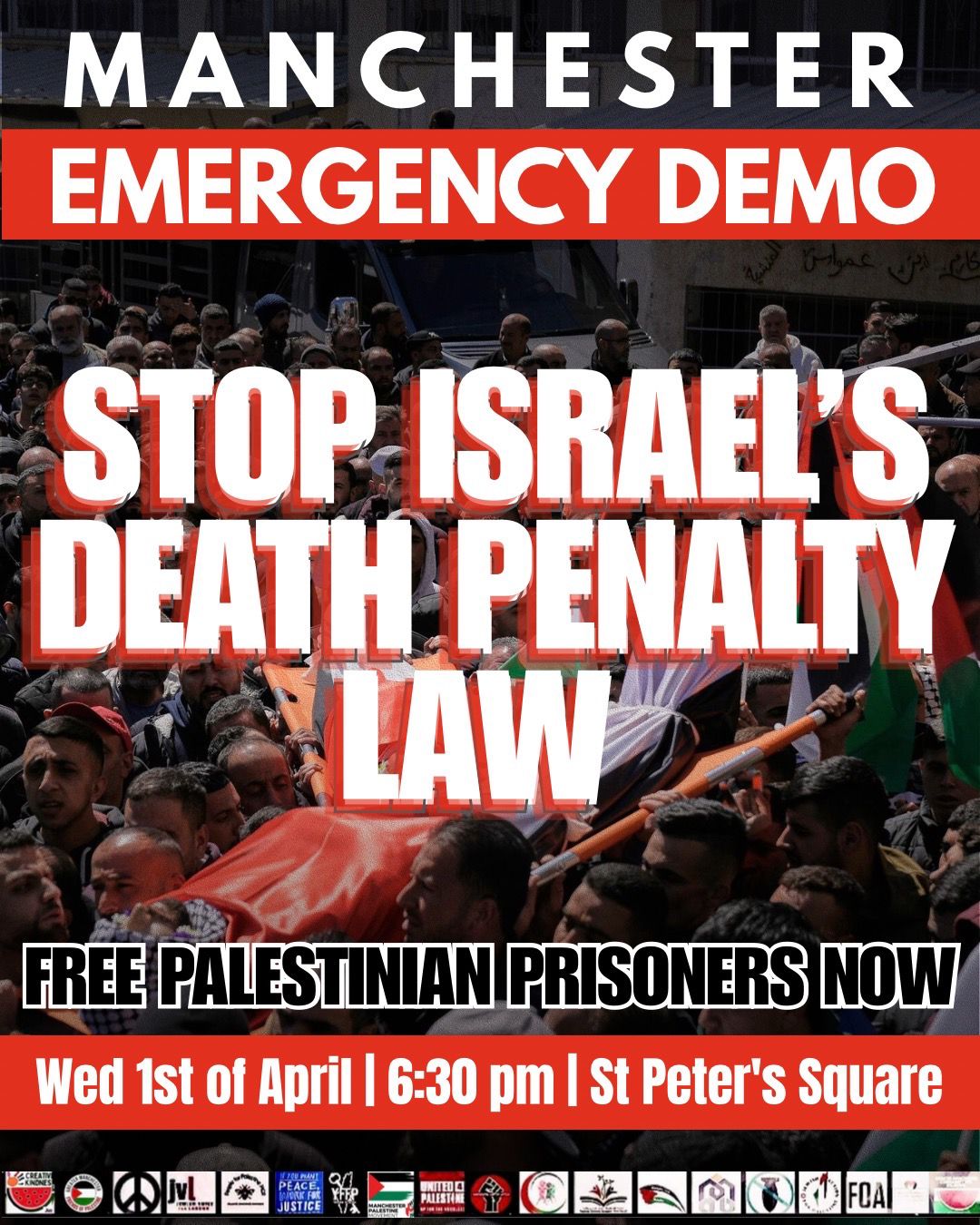 All out tomorrow in Manchester; let our voices echo throughout the streets. Free all Palestinian prisoners! Stop the death penalty law! Stop arming Israel!
