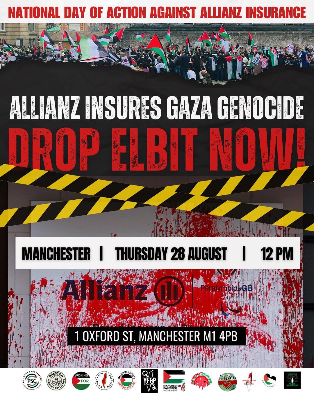 Join us in Manchester on Thursday 28th August at 12pm, 1 Oxford Street M1 4PB, to show Allianz that their investment in and insurance of Israel’s largest weapon manufacturer, Elbit Systems, has consequences!
