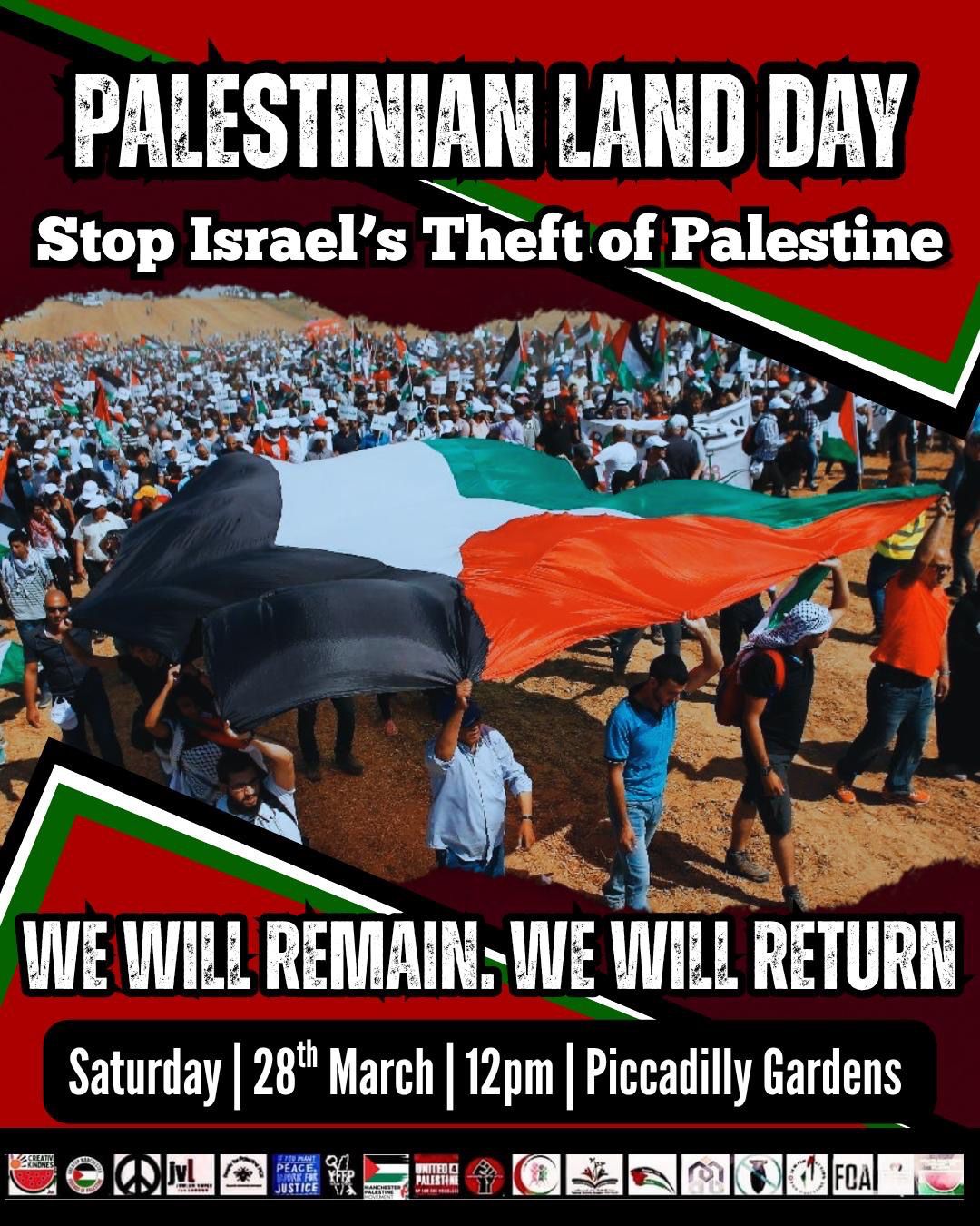 Join us on Saturday 28th March in Manchester to commemorate Palestine Land Day and the Great March of Return! Stop Israel’s Theft of Palestine! Meeting at Piccadilly Gardens, 12pm