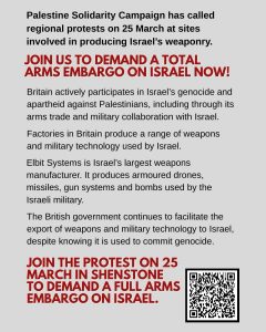 The Palestine Solidarity Campaign is mobilising to shut down Elbit Systems—Israel’s largest weapons manufacturer—in Shenstone. The British government continues to facilitate this arms trade; it is up to us to demand a total embargo.