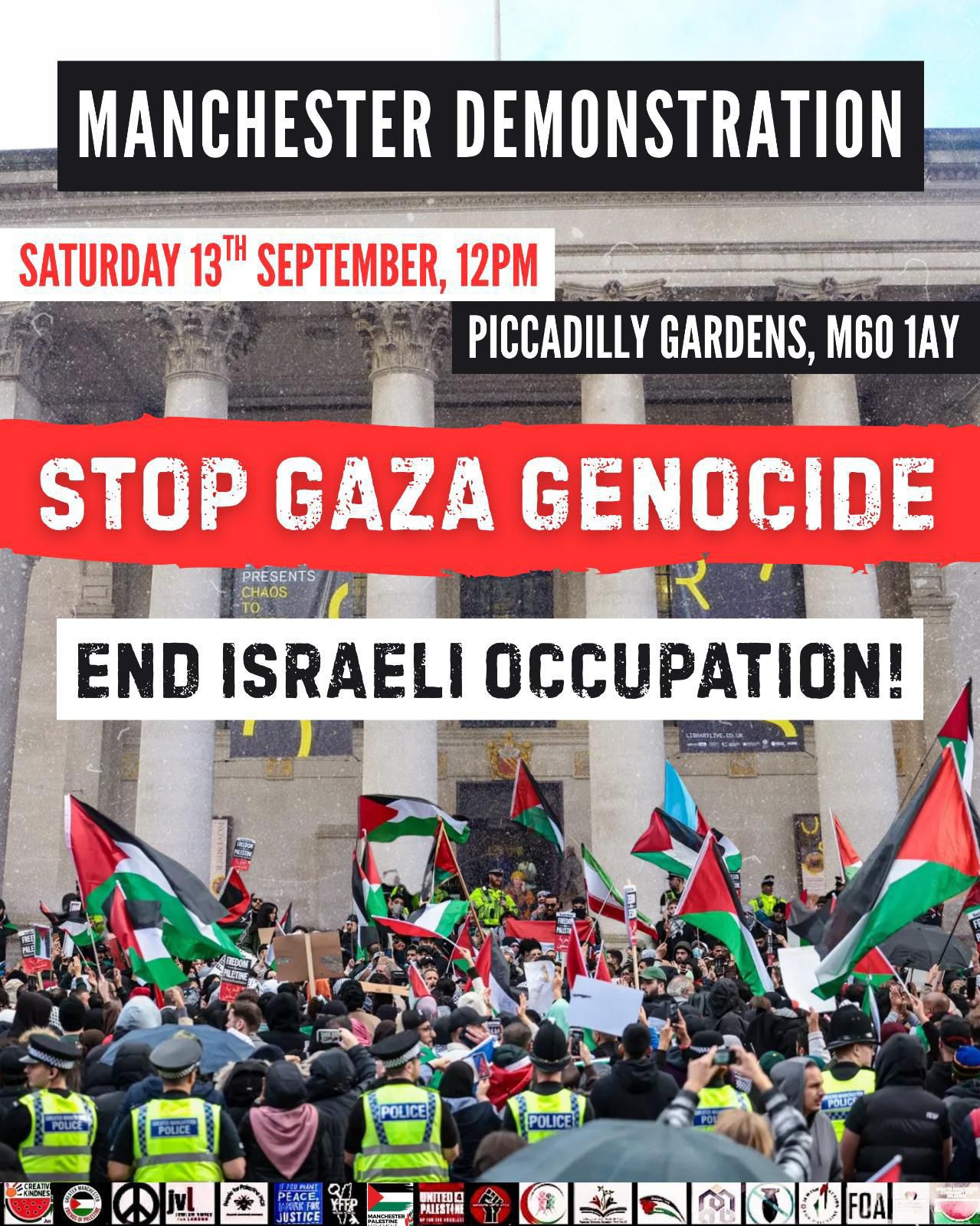 All out in Manchester on Saturday, 13 September, 12pm, Piccadilly Gardens. Stop Gaza genocide! End Israeli Occupation!